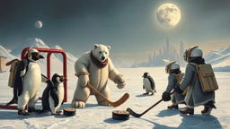 Charlie Chaplin as two unstable constable polar growlar bear on the planet of Ceres, with some penguins with hockey masks and backpacks smacking large pucks so we can see its trail, and playing hockey on frozen lake with astronauts, in front of ice megapolis
