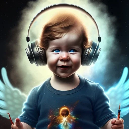 a happy human baby musician called tobias leander with hair,halo, wings, drinking, sitting in chair, photo realistic spray painting, dark wood background
