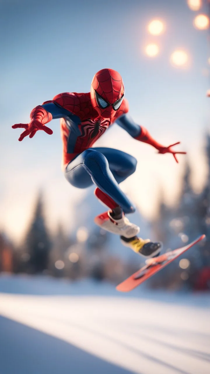 spider man jumping doing winter freestyle ski jump half pipe trick on snowboard, bokeh like f/0.8, tilt-shift lens 8k, high detail, smooth render, down-light, unreal engine, prize winning