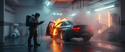 misty underground garage with parking robots and neon light, washer man with mask and hi pressure steam gadgets cleans cars and walls, walls are lined with neon lights, mechanic in weird suit washes walls and robots, a car that is burning inside is inside a washing machine, smoke and debris, warped and twisted camera angle