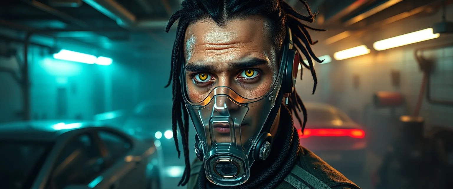 full figure portrait of young battle worn sweating indian ravnos clan vampire with deep hypnotic yellow green eyes in misty underground garage with parking robots and neon light, washer man with transparent acryl mask and hi pressure steam gadgets cleans cars and walls, walls are lined with neon lights, mechanic in weird suit washes walls and robots, a car that is burning inside is inside a car washing machine with big rolling brushes, smoke and debris, warped and twisted camera angle, dark asph