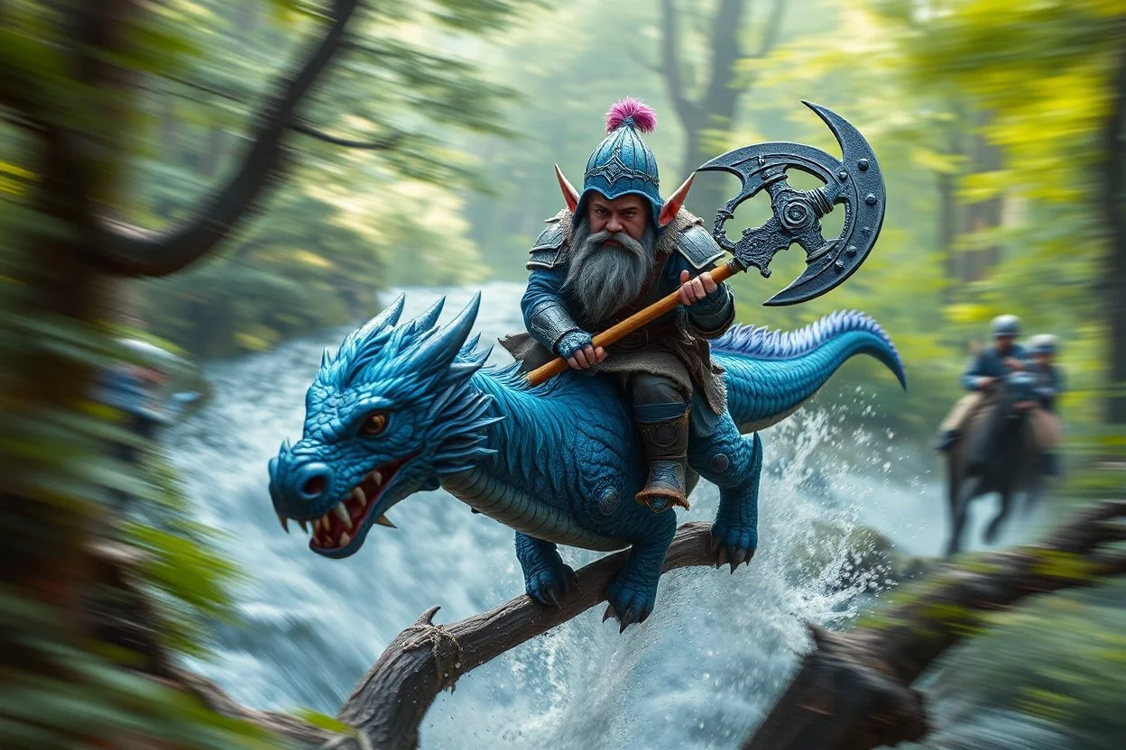 oil painting ,motion blur portrait of harpy - Forgotten Realms dodging cyberpunk armored dwarf with war half moon axe hammer with spikes, riding tiny furry blue and purple dragon above water and along winding branches in lush green forest along speeding horses , bokeh like f/0.8, tilt-shift lens 8k, high detail, smooth render, down-light, unreal engine, prize winning