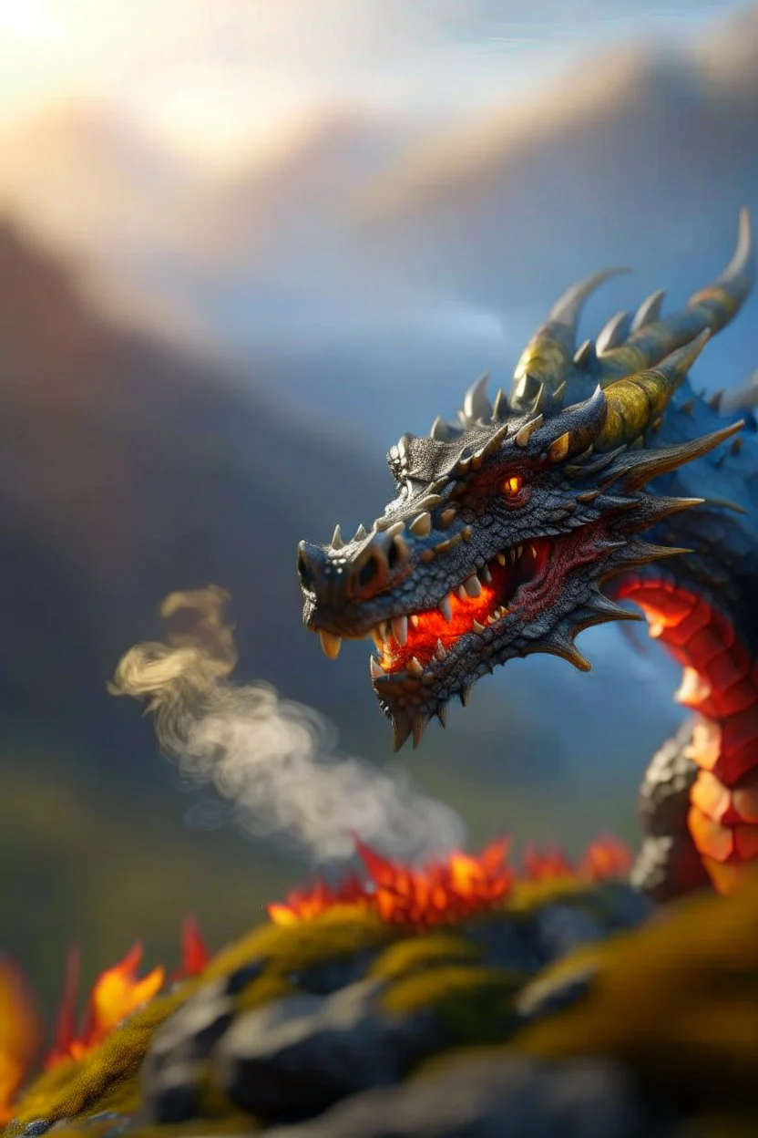 portrait of dope dragon blowing some fire smoke rings on mountain top, with rock giant creature in the background,shot on Hasselblad h6d-400c, zeiss prime lens, bokeh like f/0.8, tilt-shift lens 8k, high detail, smooth render, down-light, unreal engine, prize winning