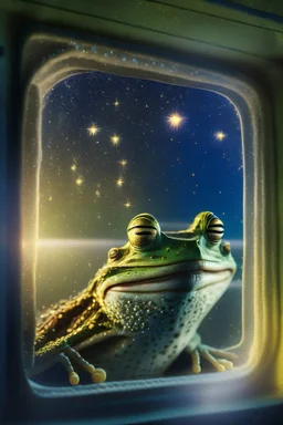 smiley frog with background star field seen in the window of a boat, 4 k, trending art, depth of field, high detail, high contrast