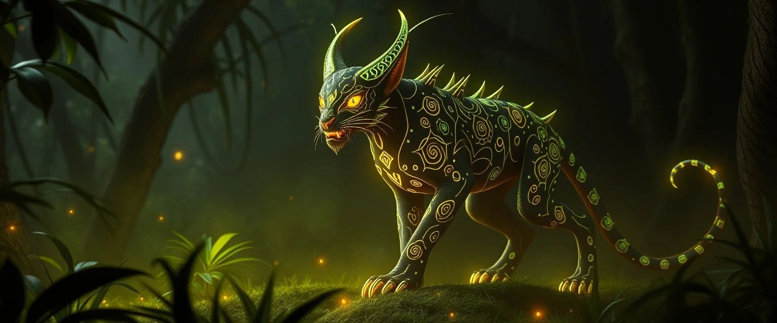 tezcatlopoca glowing voroni glyph patterned ultra sentient species lynx psionic master in dark jungle
