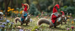 depth of field, aura with halo, close up on blue and red clothed gnome riding hedgehog opossum with lance in garden of eden in the style of Escher and Giger