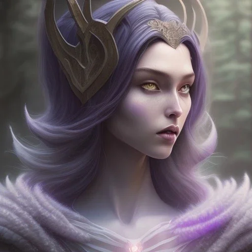 Closeup of a young wizard dark elf in a misty forest, lavender colored eyes, 4k, Highly Detailed, Masterpiece, Pretty but evil Face, perfect eyes, Digital Illustration, Cinematic Lighting, Realistic, Sharp Focus, Centered, Beautifully Lit, Bioluminescent by Stanley Artgerm Lau