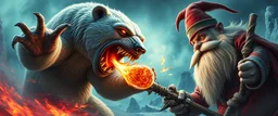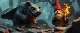 epic movie poster, fire drop bear vampire vs gnome goblin rock priest, fish eye lense