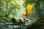 oil painting ,motion blur portrait of harpy - Forgotten Realms dodging tiny yellow dragon above water and along winding branches in lush green forest along speeding horses , bokeh like f/0.8, tilt-shift lens 8k, high detail, smooth render, down-light, unreal engine, prize winning