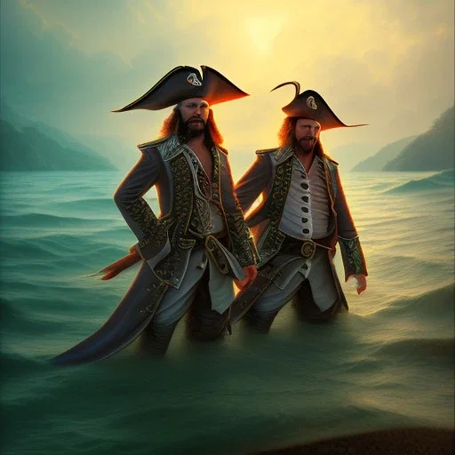 two pirate actors on beach, water, reflection, book cover, fantasy art, misty