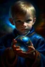 book cover illustration, oil painting portrait of metallic sleeping slightly cute smirking innocent blue eyed vampire holding small earth on a platter in one hand, bokeh , high detail, smooth render, prize winning, down light, depth of field, aura, in wind