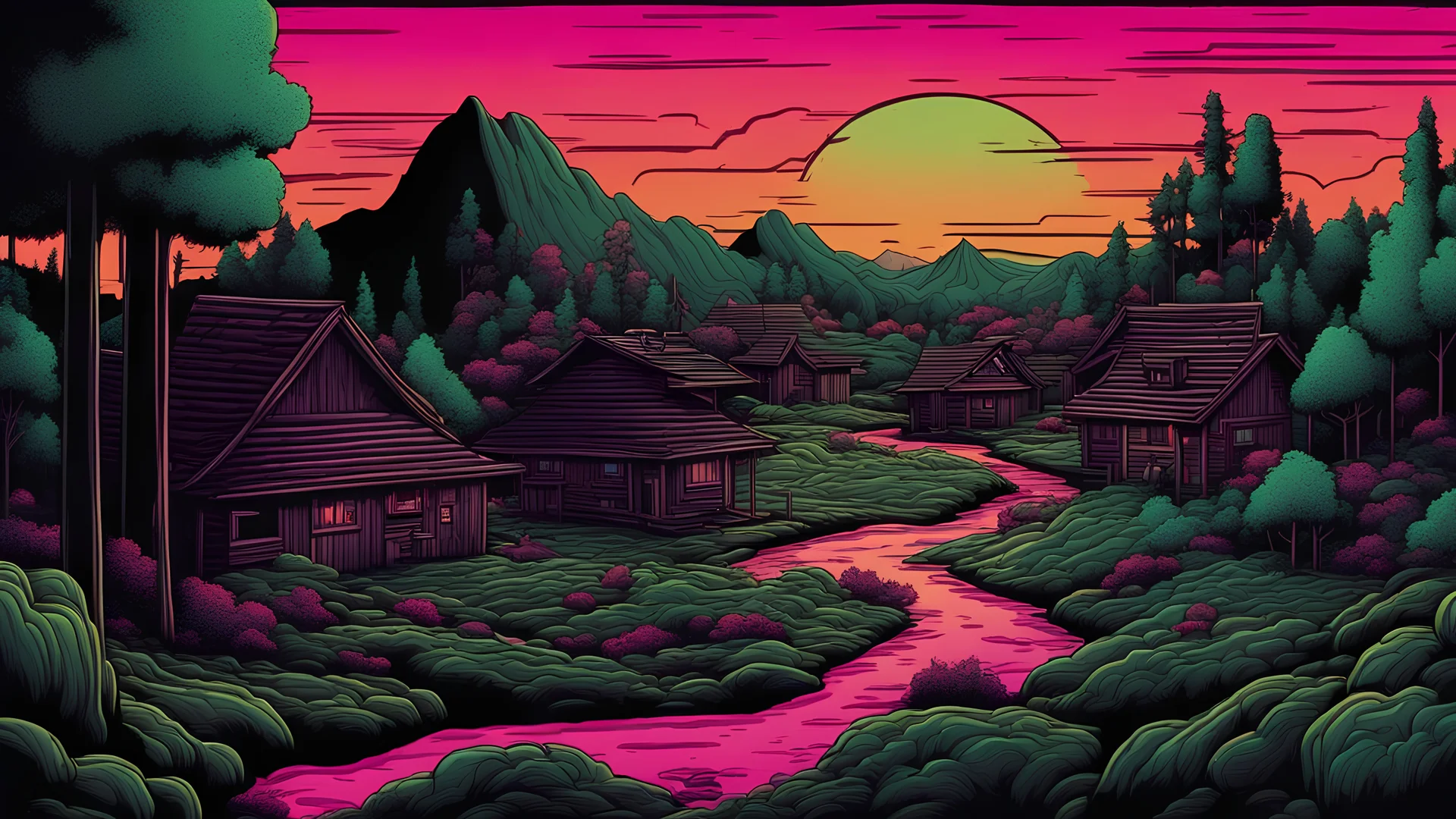 comic style, 80's landscape, wooden city in nature, negative space, space quixotic dreams, temporal hallucination, psychedelic, intricate details, sunset neon colors with a lot of green and deep black background, 4K, very high contrast, chiaroscuro