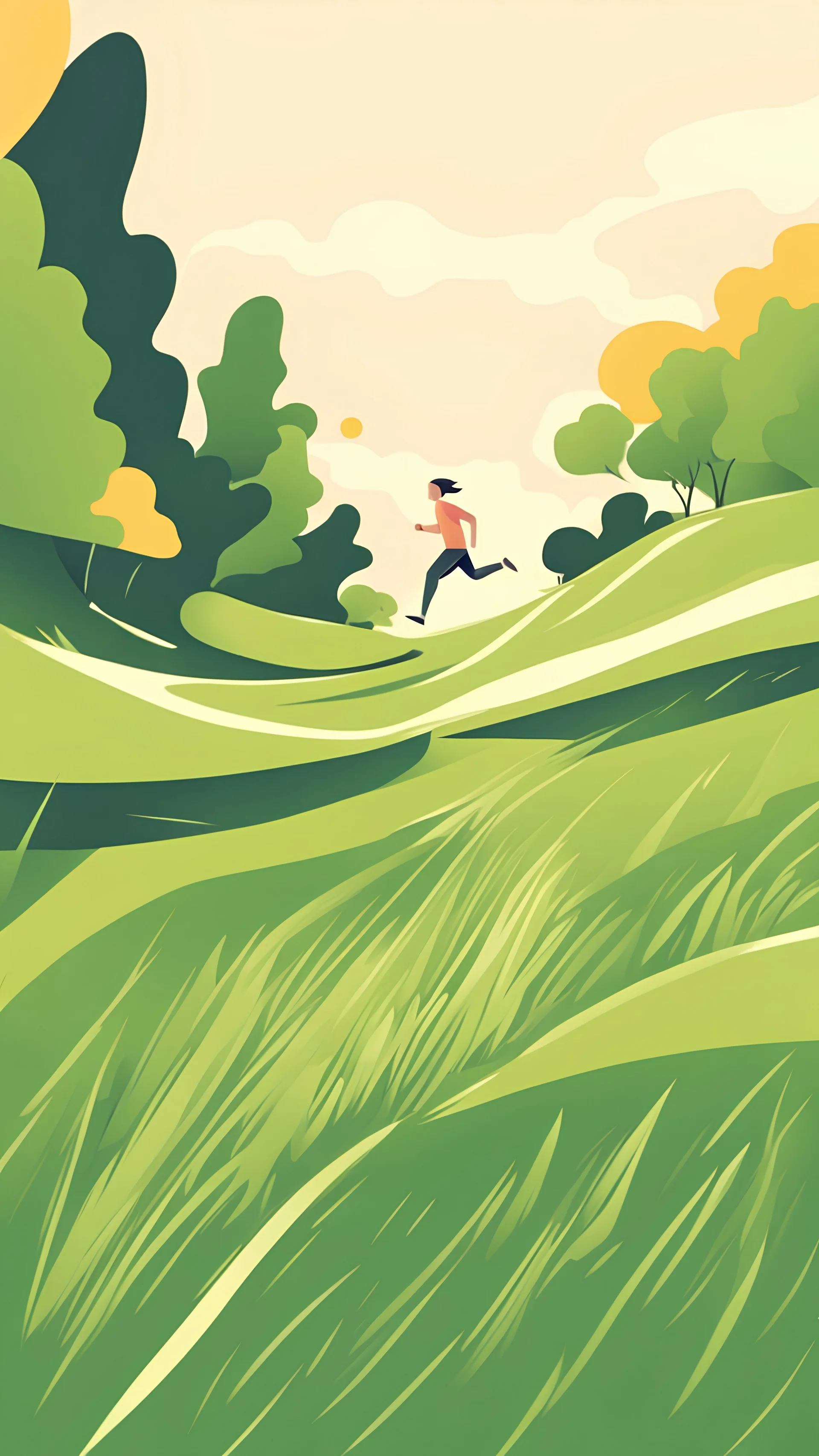 A person running in a place on the ground of grass, an optimistic image in Abstract style