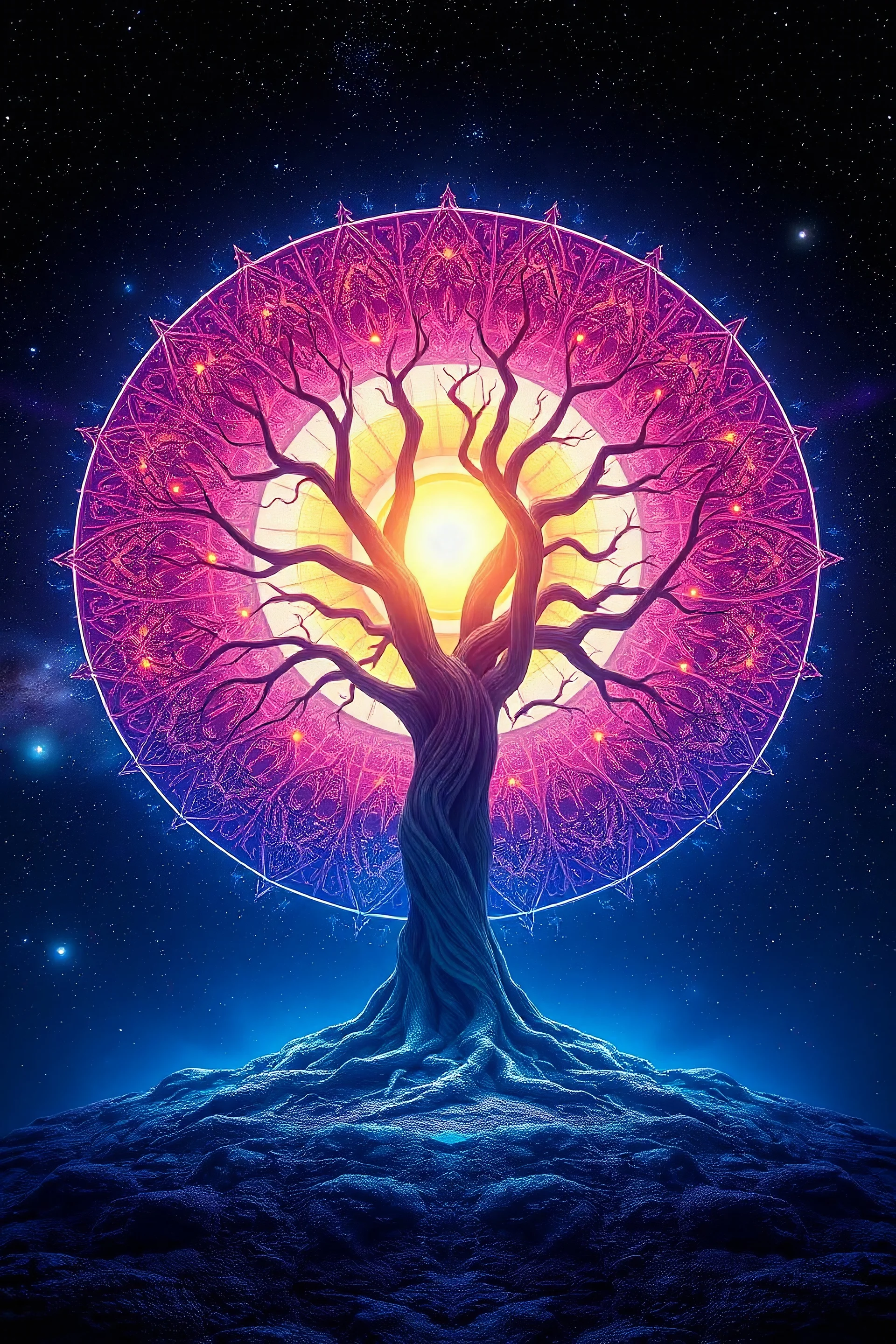 acient tree growing out of a bright glowing mandala, uv reactive colors, maximalist 3d matte masterpiece, round composition, galaxy in background