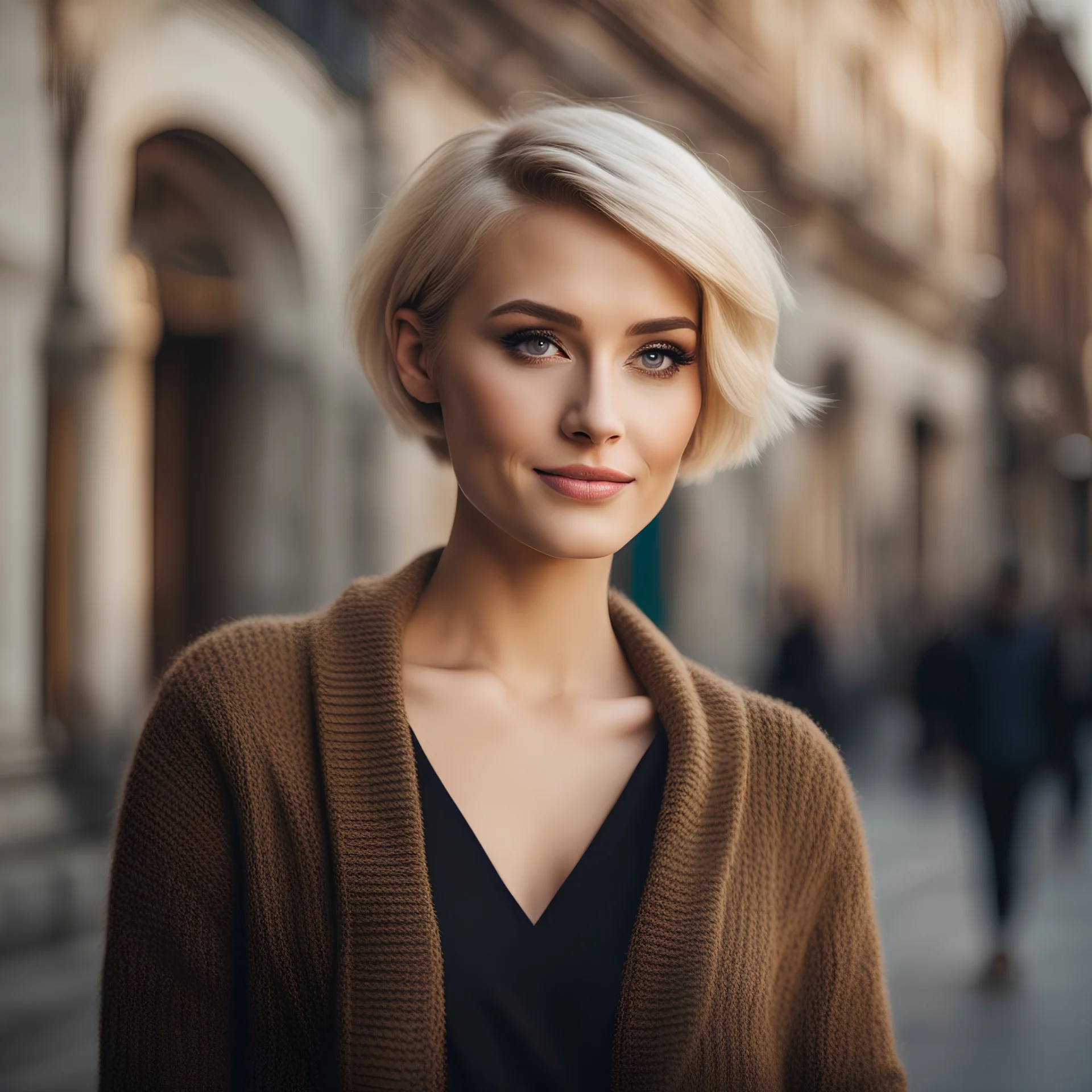 beautiful young woman with short blond hair, in a fashionable cardigan, against the background of the street, stylish photo