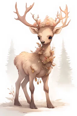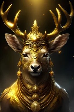 A mystical deer god with gold and small ruby jewelry. There should be a crown taller than the antlers.