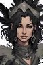 smiling woman in fantasy ranger clothing with feathers stuck in black messy hair , d&d character art, curse of strahd