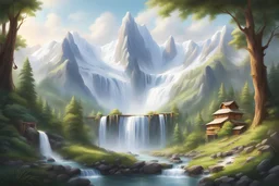 A scene of a majestic mithological gods town on mountain range, with a cascading waterfall and lush greenery, in the style of Albert Bierstadt and Thomas Moran, with a sense of grandeur and awe-inspiring beauty.