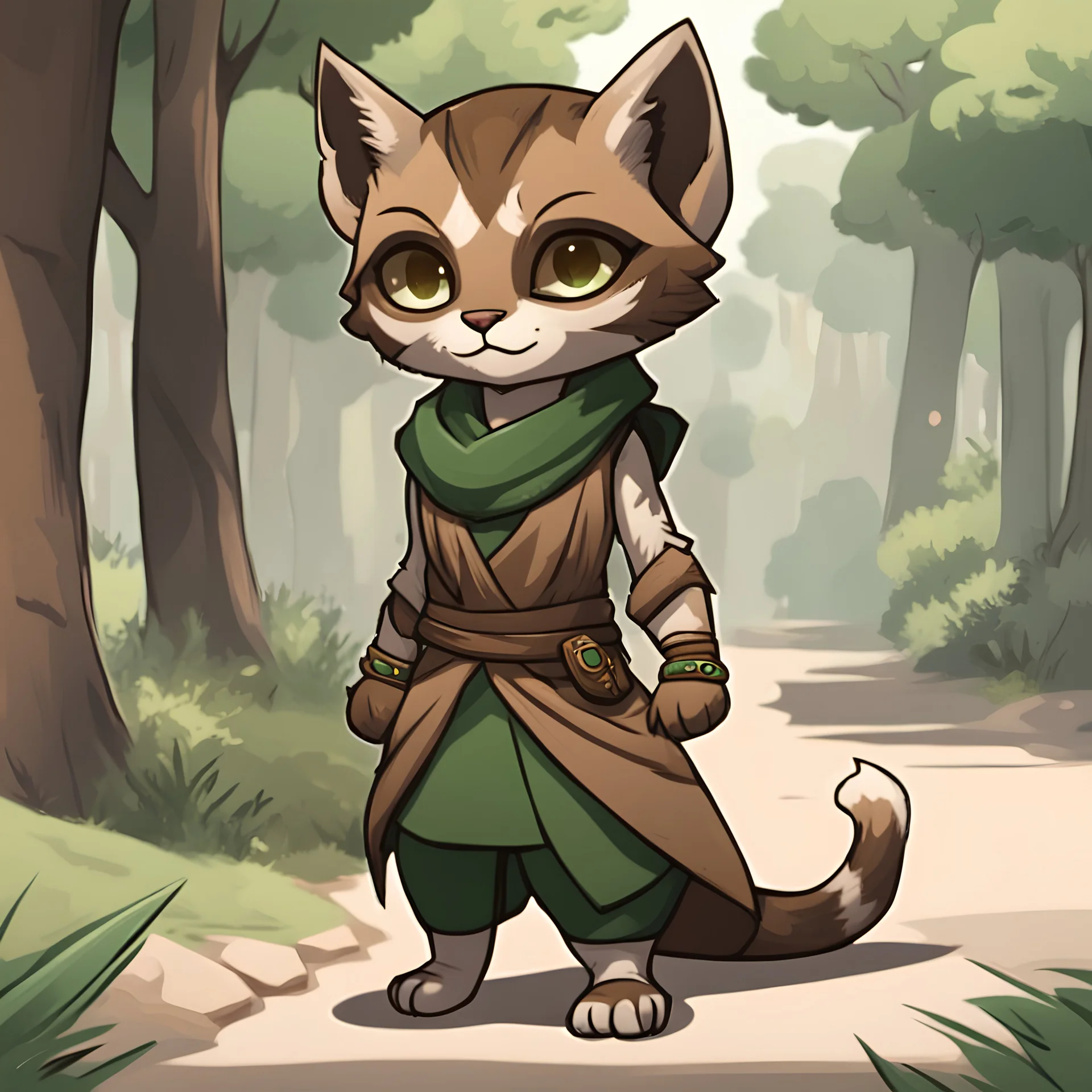 Abuana is a female Khajiit with tan fur and brown face marking wearing a brown hajib with a sleeveless forest green and brown tunic and pants works at a outside bank, in chibi art style