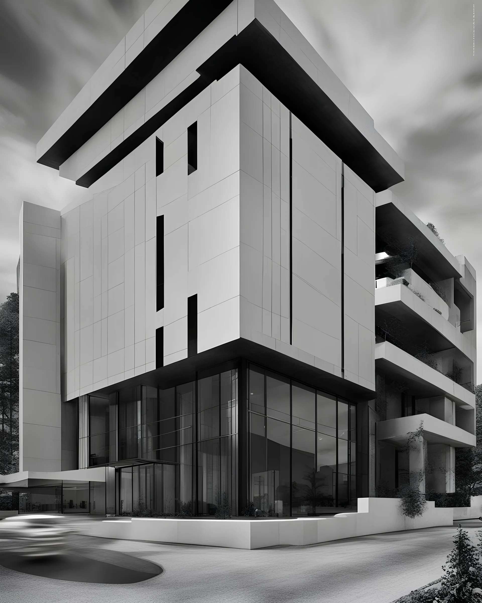 An advertising poster of a construction brand named Arshit group , Minimal with black and white and grey color