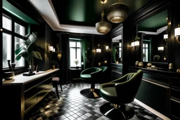Cinematic shot of a dark emerald green office in the style of art deco with gold accents