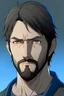 Portrait of a man in his early 30s who has a wider face, with a small scar on the left cheek, and looks lean but athletic. Has a short black beard and close cropped black hair. Has blue eyes. Anime artstyle.