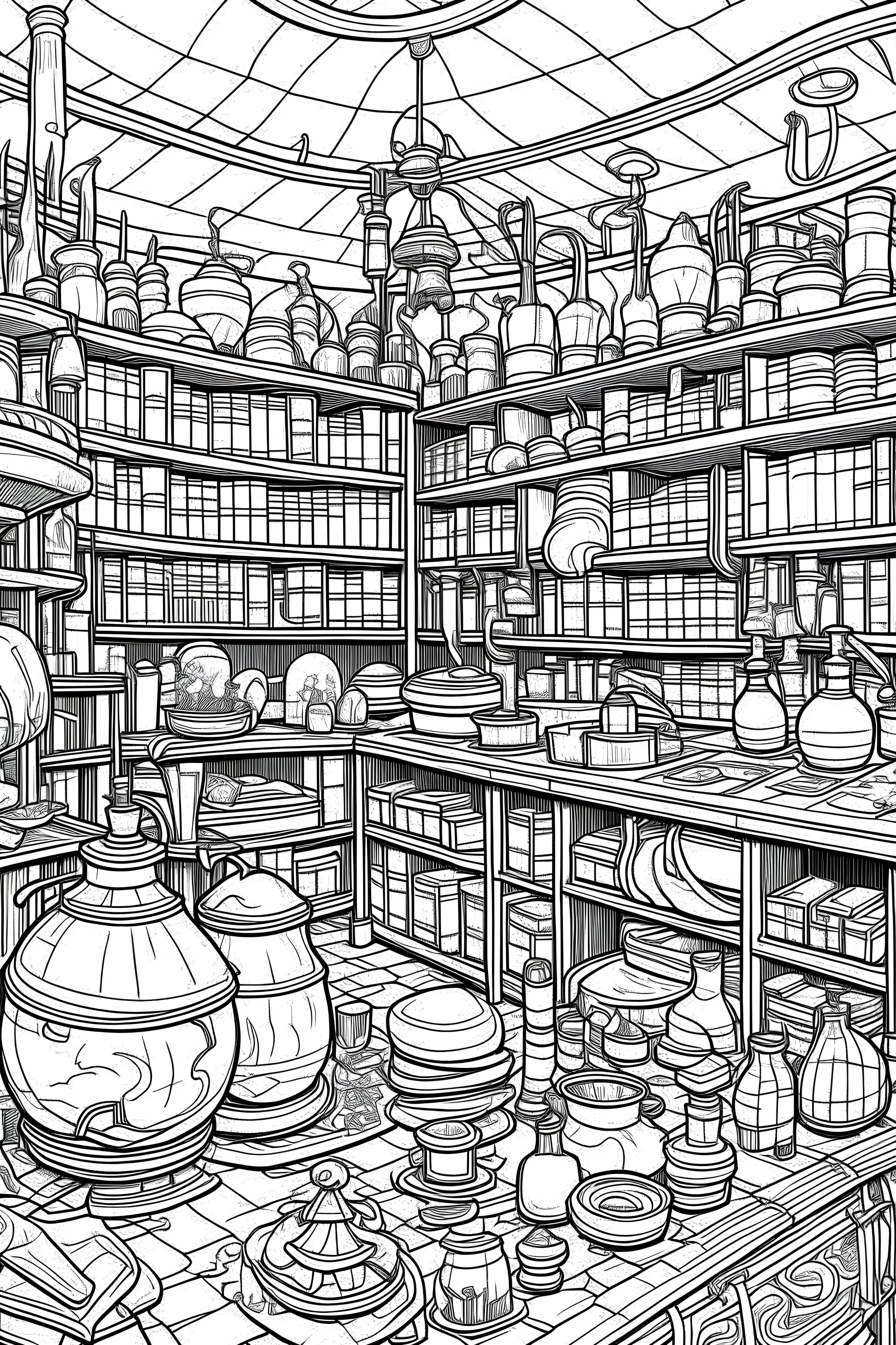 coloring page of A mysterious potion laboratory, featuring bubbling cauldrons, shelves filled with magical ingredients, and spellbooks open to arcane incantations.