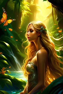 "Craft a captivating digital painting featuring a pretty anime girl, her long, soft, shiny golden hair cascading around her. Her lovely bright blue eyes captivate the viewer as she stands surrounded by a serene lake adorned with pink lotus flowers. The girl is fully dressed in gorgeous glowing lotus flowers, set against a backdrop of a glowing night sky filled with vivid colors. Your artwork should transport the audience into a scene of tranquility and beauty, inviting them to lose themselves in
