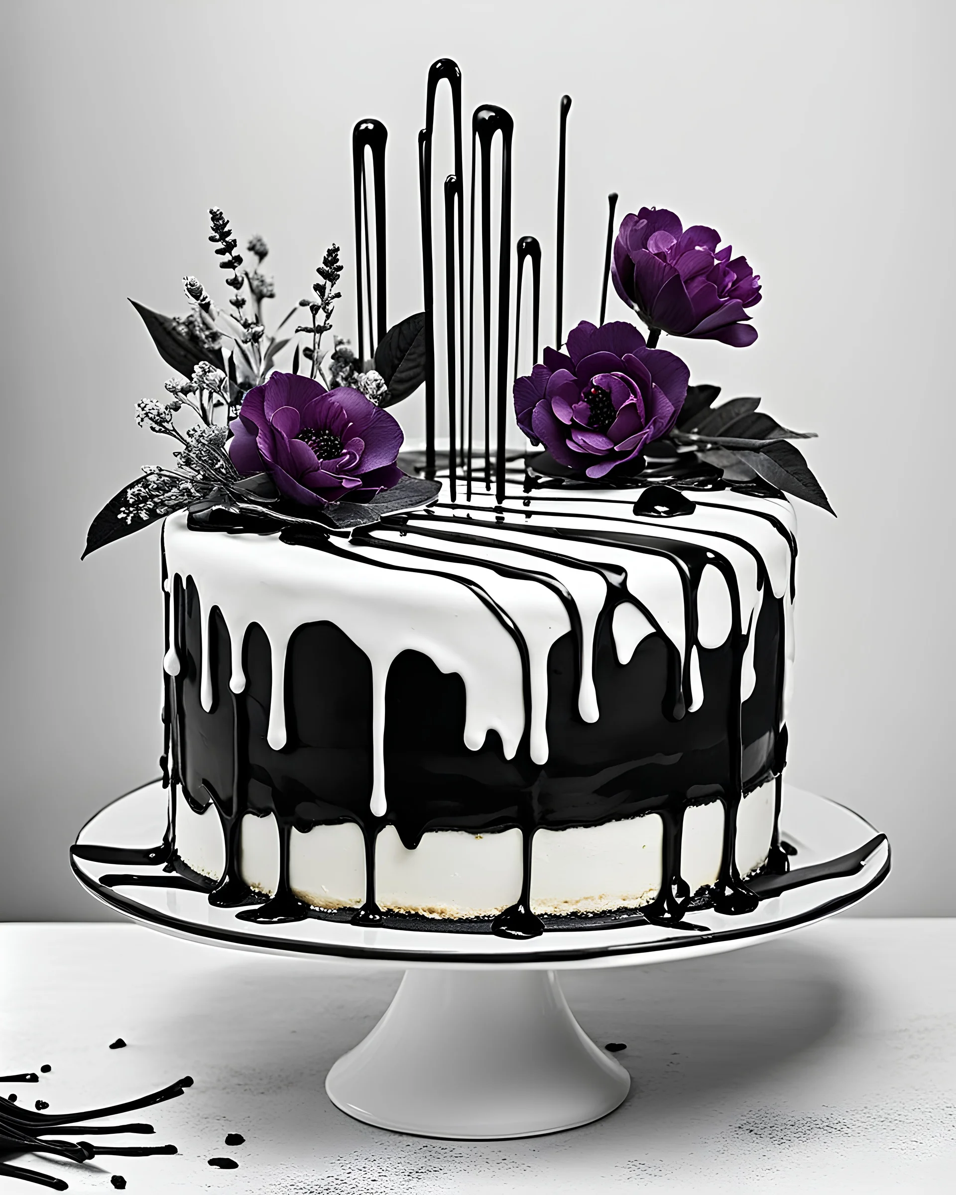 drip cake style with the elegance of edible flowers for a visually stunning cake ,colouring page,white background, bold black lines, simple details, black and white