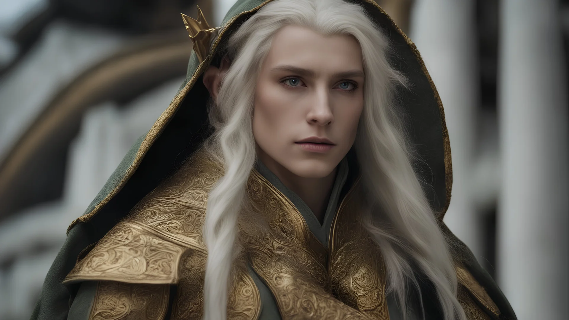 Photoreal close-up of an elf en-profile beardless elf looking up tall rugged and sturdy golden-eyed elf poet historian with golden eyes and long silver hair but beardless and golden eyes in colorful robes in front of an enormous white temple in Faerun at full moon by lee jeffries, in the style of fantasy movies, shot on Hasselblad h6d-400c, zeiss prime lens, bokeh like f/0.8, tilt-shift lens, 8k, high detail, smooth render, unreal engine 5, cinema 4d, HDR, dust effect, vivid colors