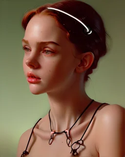 Ultra realistic rendering of a Norman Rockwell style illustration of a nubile, Pert, thin, young woman with 1950s style short hair, wearing an open blouse with bondage lingerie underneath, nipples, bare breasts