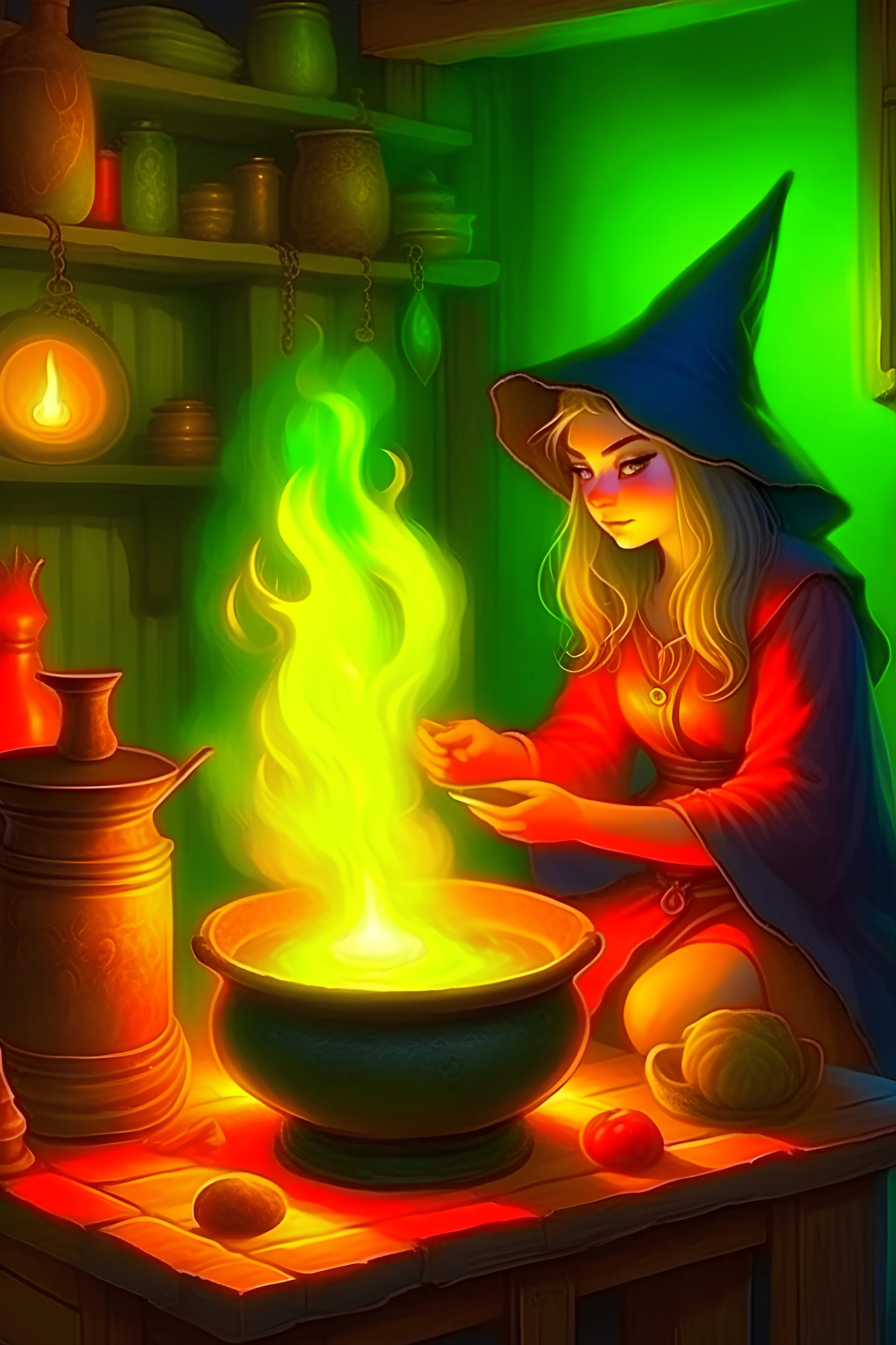 Elf witch with cat, looking into glowing cauldron, background alchemists workshop