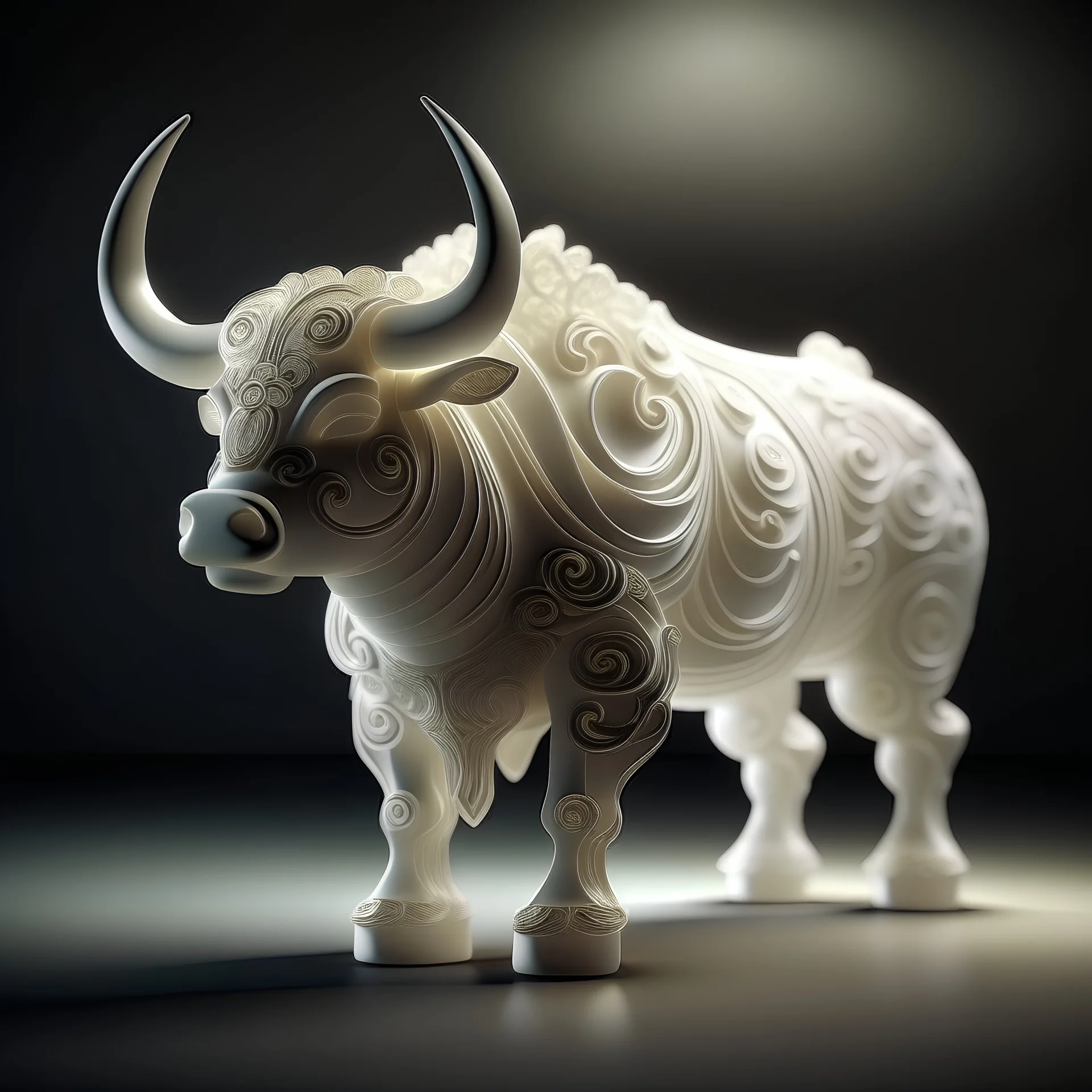 stylized white onyx chinese zodiac OX with subscattering lighting, intricate carving, depth of field, dramatic, cinematic, studio lighting, low angle, reflection, diffuse light