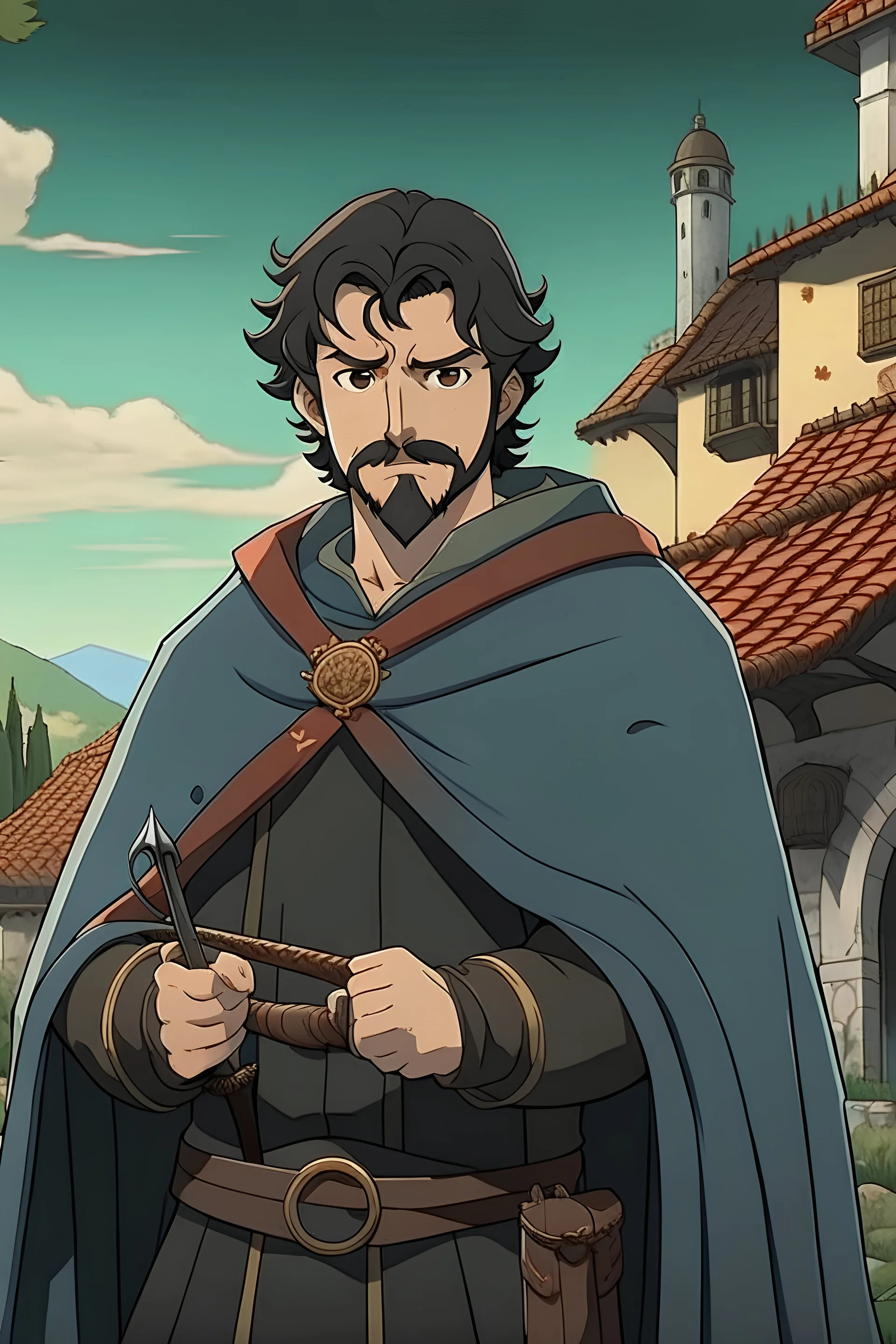 Jjk screen with short, curly black hair, big brown eyes, and a short mustache. Beautiful background scenery of a house behind him with a sword in his hand and the cloak of the reconnaissance group. With studio art screenshot in studio