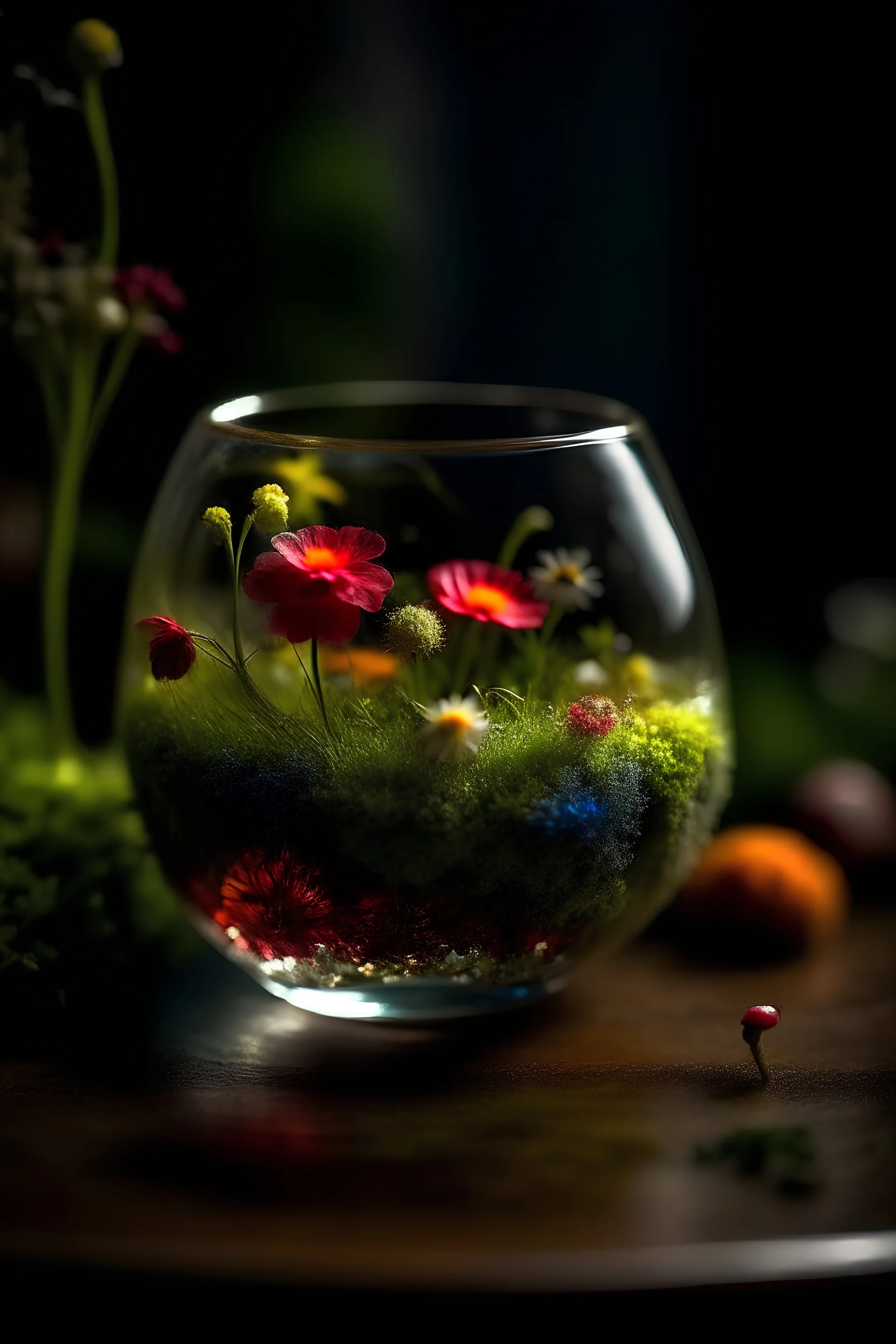 Flowers made of stardust in a glass, above moss, Details, sharpness, 8K, highest quality, masterpiece,