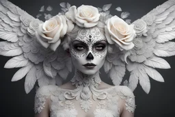 beautifull sugarskull , pretty eyes , big wings, Absolute harmony, ornate pattern, White roses covered with rime, magical, inspired by a fantastical world, crystallized product photography, soft light, volumetric lighting, ultra-detailed photography, grey background, Perfect anatomy. "hibli studio + super high resolution + UHD + HDR + highly detailed + FStop 2. 8 + 150mm lens + high fidelity + studio shot + award winning + ray tracing", epic royal background, big royal uncropped crown, royal jew