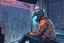 a man with a complex helmet large visor connected to wires, cyberpunk, tshirt and jean pants, window at the city, fog, hovering cars, comic book art style, night time,