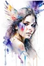 A detailed illustration of a beautiful young female with wings. Her skin, hair and face are all made of dripping paint. Her wings are spread. Front view. Highly detailed flawless facial features and eyes. Abstract watercolor painting splash art. White background, wide angle, abstract design, beautiful, thick flowing paint strokes, dripping paint, fantasy art, modern art, ((soft happy complimentary colors,)) modern aesthetic, focused on the character, 4K resolution.