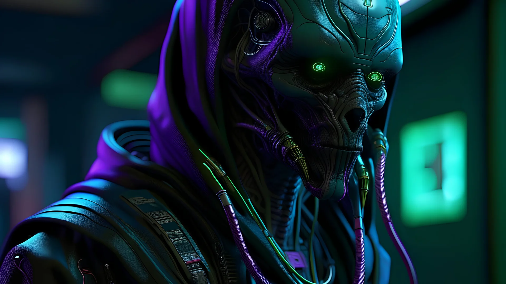 cyberpunk neoromancer and alien based 3D Print of an cyberpunk masked neuromancer dystopian mage, semi realistic human render, blender, ultra detailed, purple and green, Controlled Randomness, depth of vision, depth of field, sharpness 35%, Low Light Photography, Unreal Engine 5, OctaneRender, object illumination, ambient occlusion, metallic texture, static background, aesthetic, cyber, glossy, glow, bloom, surrealism,