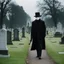 photo raw, 8k uhd, 1990s film still, man in black trenchcoat and black hat, wearing full white mask, white hair, in a cemetary during the day, sharp focus, realistic,