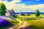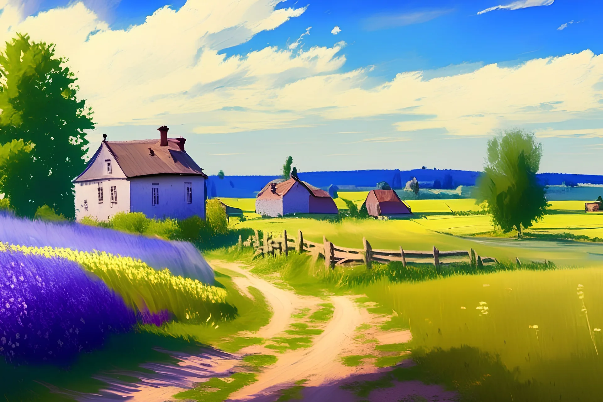Sunny day, clouds, little lake at right, grass, houses, purple flowers, dirt road, trees, distant mountains, distant trees, photography
