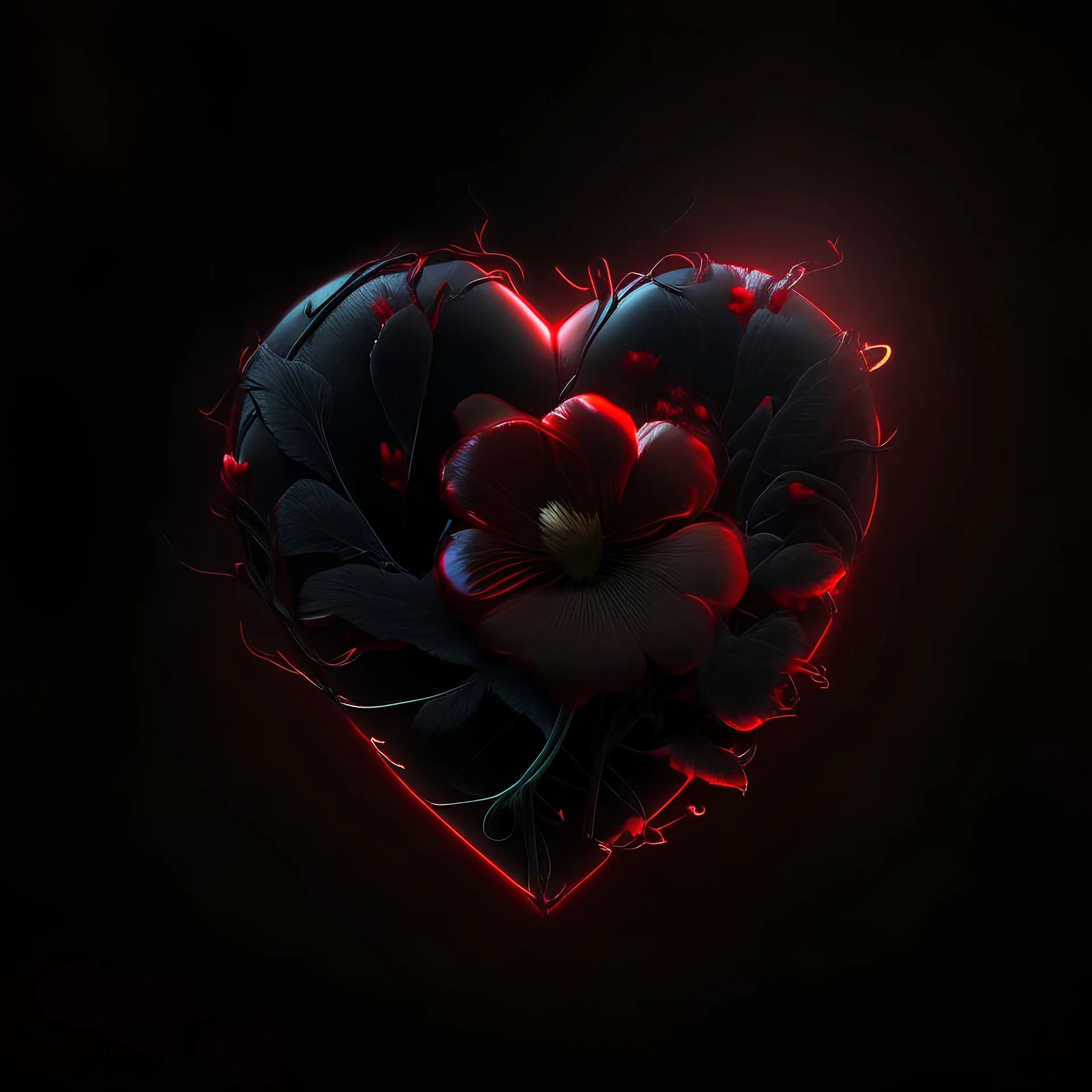 HD, photorealistic, black background, glowing red heart with a flower behind it