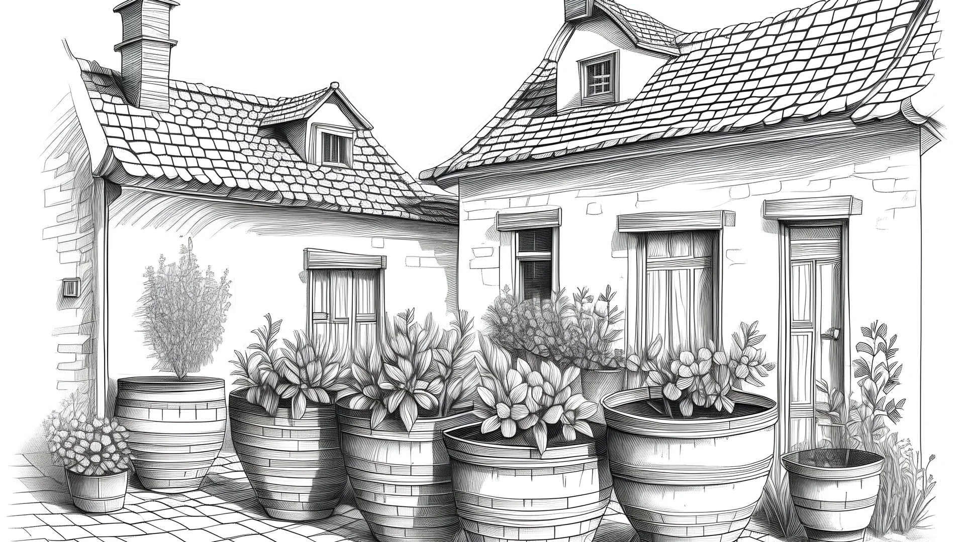 ферма, пустые цветочные горшки, вид сверху спереди, рисунок в карандаше
