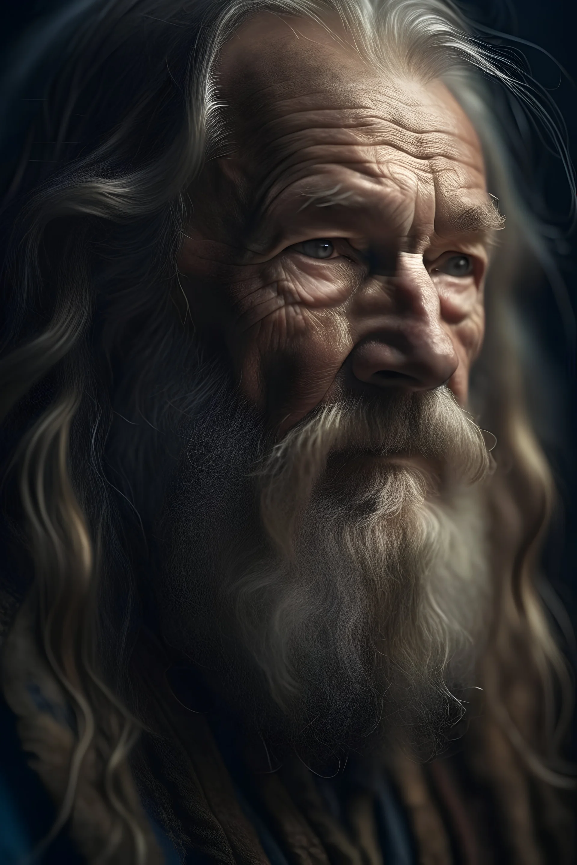 A close up picture of a s very old man with long hair and a beard, by Johannes Sveinsson Kjarval, dynamic cinematic lighting, test of time, highly detailed, wise, portrait of a rugged warrior, color graded, Nordic