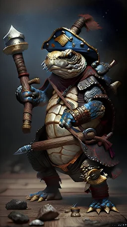 A green turtle dress up like a pirate , tri hat , and outfit , holding a weapon that looks like thors hammer ready for battle