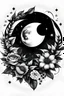 Realistic black and white digital Tattoo design of crescent moon against a night sky with stars framed by peonies, dahlias, And coffee arabica plant
