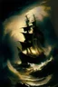 Romantic painting inspired by J. M. W Turner, shipwrecked at sea with people on board, painted in dark colors