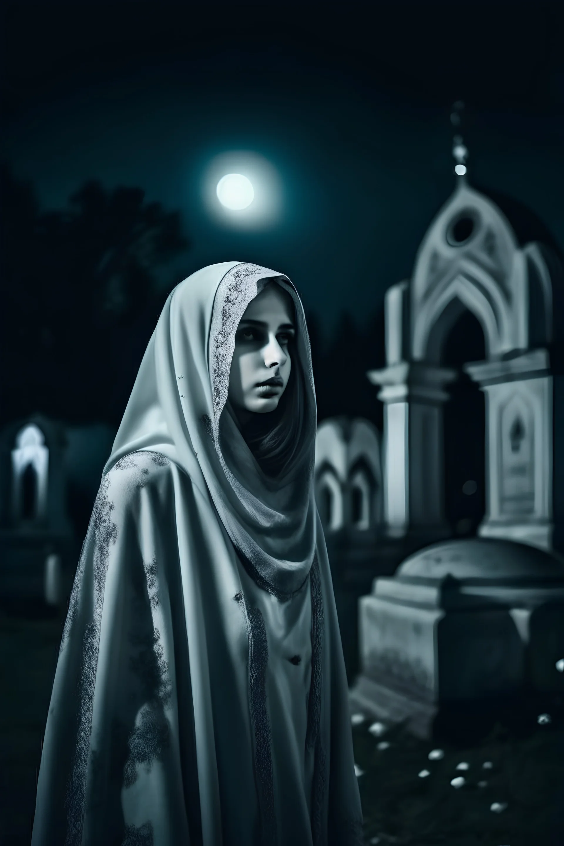 A beautiful and mysterious veiled girl stands in front of the camera in an Islamic cemetery under the moonlight