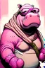 A pink hippo that is a ufc fighter, wearing a scarf, goggles, comic book