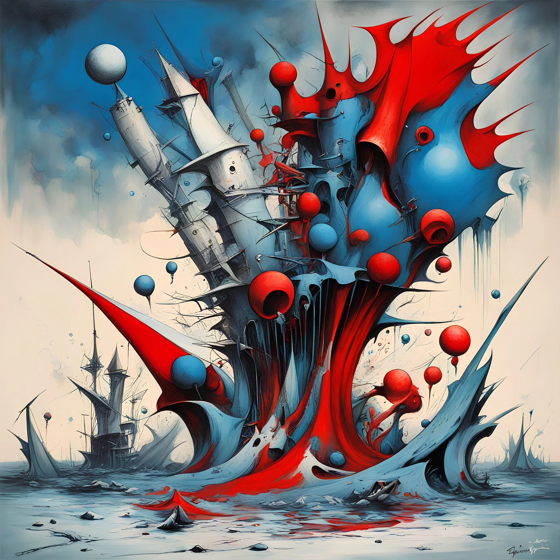 Bankruptcy of creative destruction, asymmetrical surrealism, dramatic distressing, by Gerald Scarfe, by Yves Tanguy, color splash, splash art, red and blue dual color scheme, zero sum game.